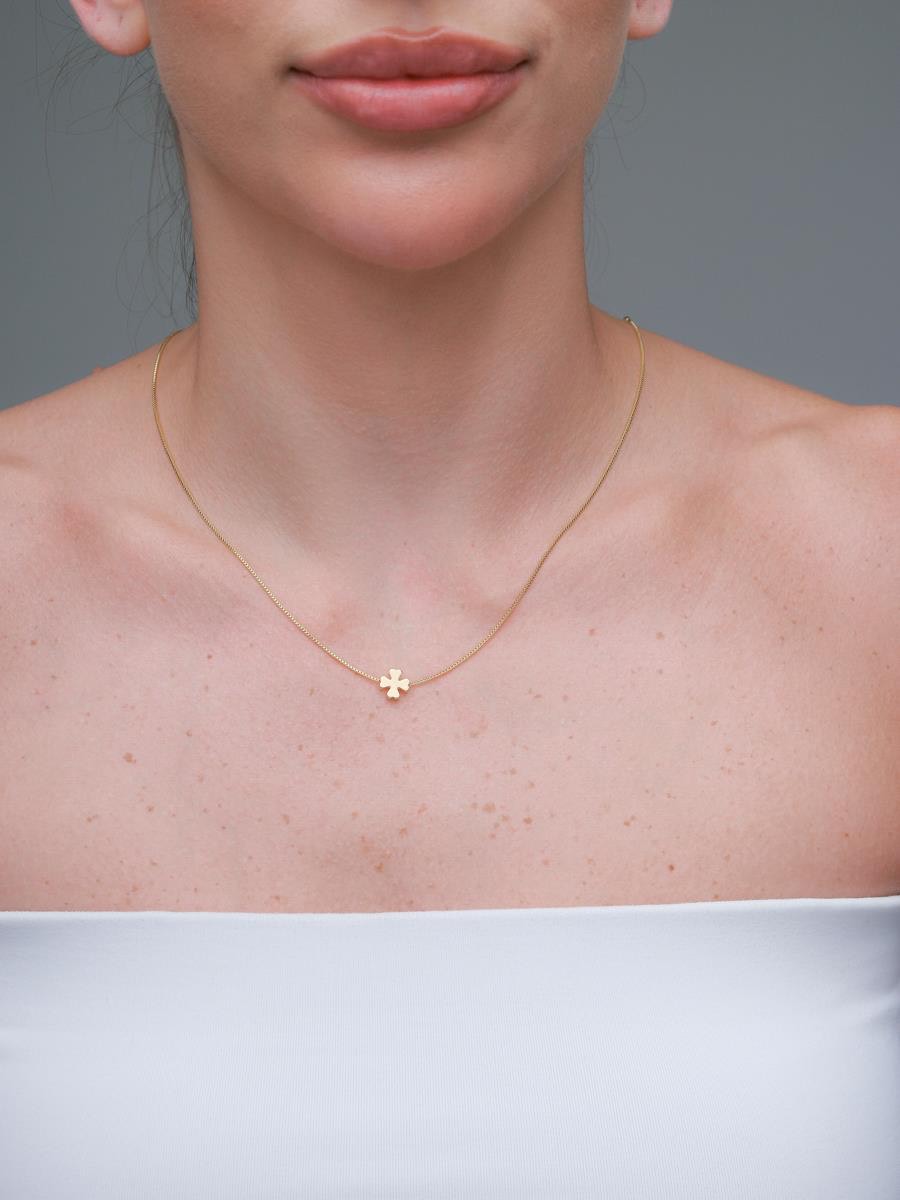 Elegante e atemporal, este colar estilo veneziana apresenta um delicado pingente em formato de trevo de quatro folhas, símbolo de sorte e boas energias.